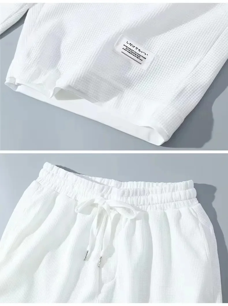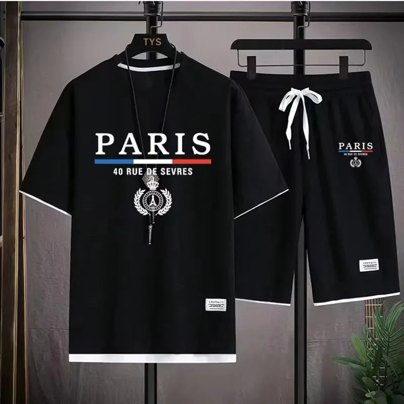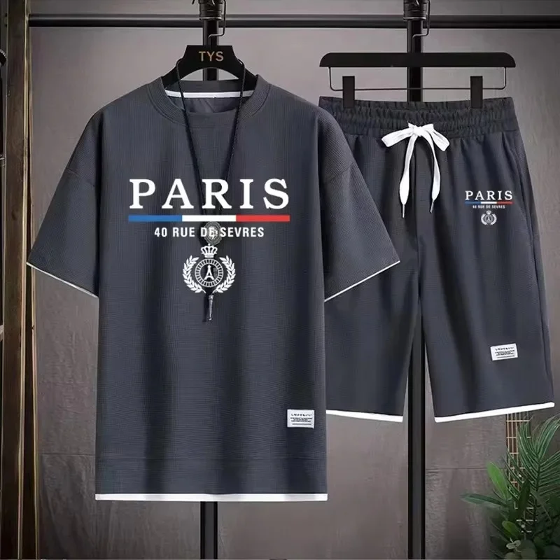 طقم وافل رجالي، تي شيرت كاجوال + طقم شورت 2 قطعة، طقم ملابس رياضية صيفي للرجال، طقم ملابس رياضية، طقم فضفاض، زي تي شيرت رجالي